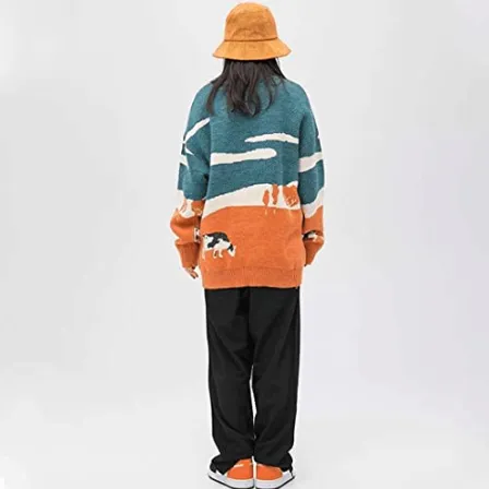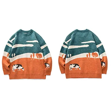 Vintage nagy kötött pulóver, füves tehénmintával, természetközeli stílussal, kerek nyakú hosszú ujjú pulóverrel, 100 pamut, ráncálló, gyors száradás, pilling elleni, lélegző.